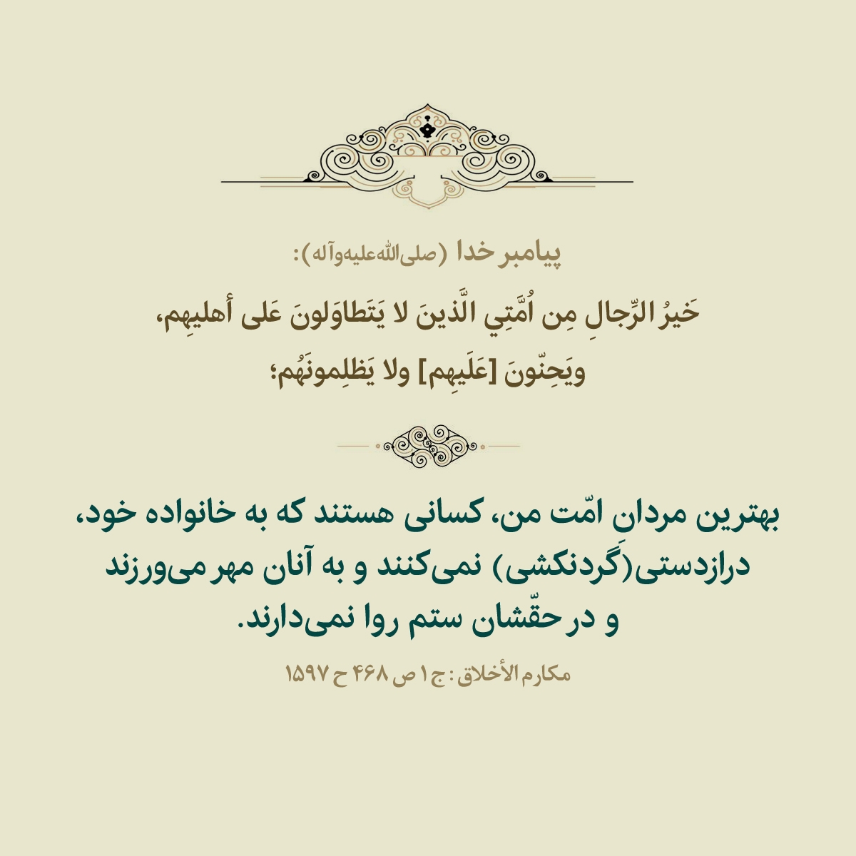 بهترين مردانِ امّت من، كسانى هستند كه به خانواده خود، درازدستى(گردنکشی) نمىكنند و به آنان مهر مىورزند و در حقّشان ستم روا نمىدارند.