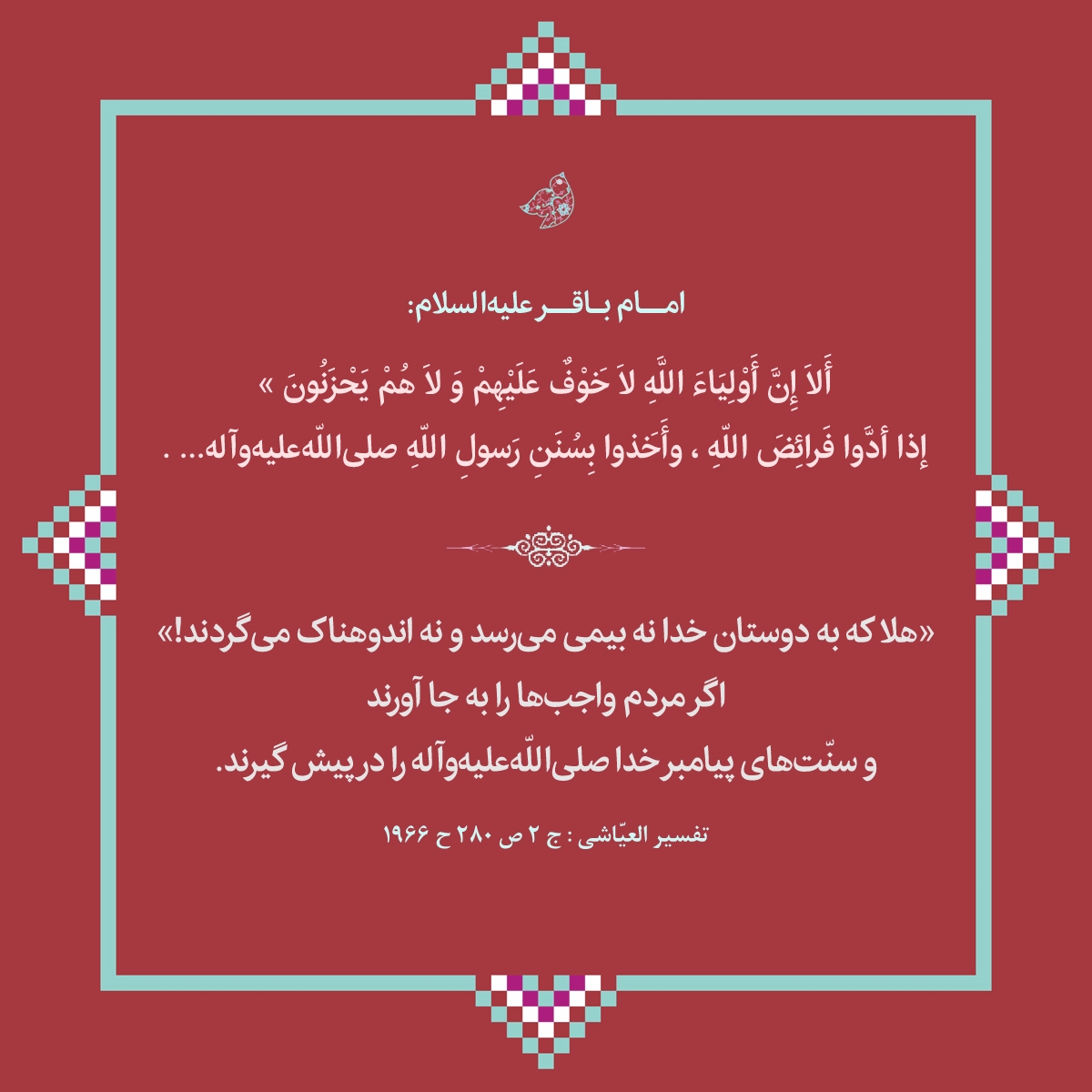 هلا كه به دوستان خدا نه بيمى مىرسد و نه اندوهناك مىگردند!» [يعنى] اگر مردم واجبها را به جا آورند و سنّتهاى پيامبر خدا صلى اللّه عليه و آله را در پيش گيرند... .