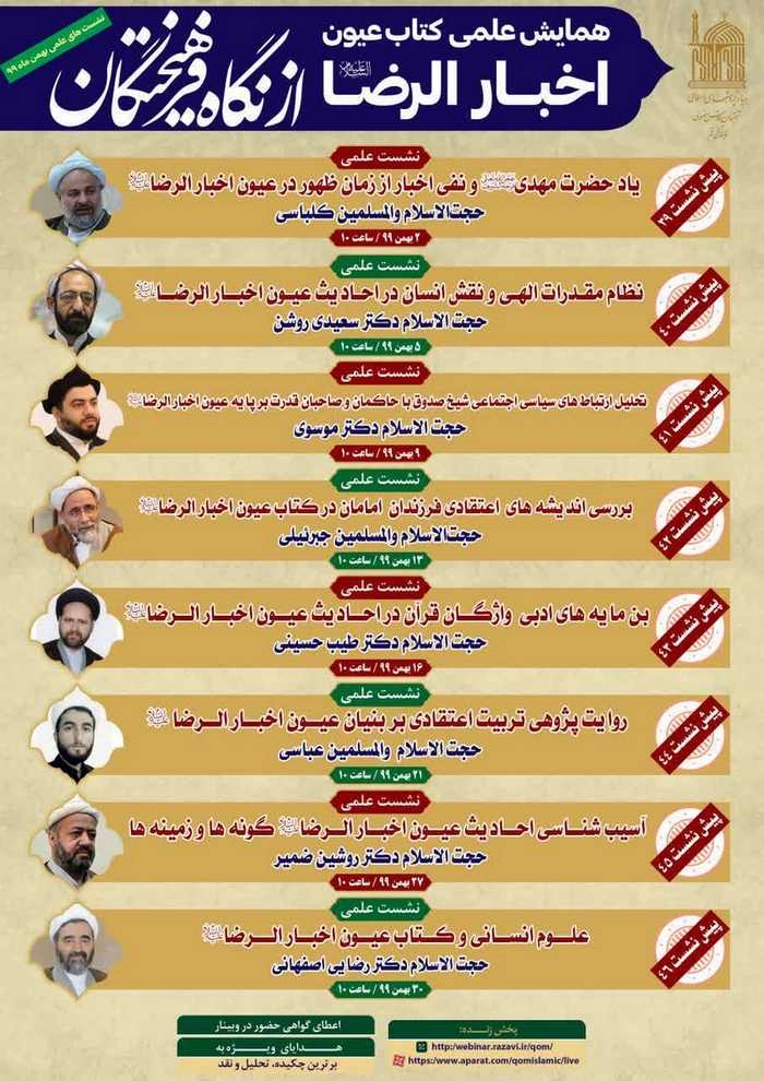 به همت نمایندگی بنیاد پژوهشهای اسلامی آستان قدس رضوی در قم ۸ نشست علمی از سلسله نشستهای کتاب عیون اخبار الرضا (ع) از نگاه فرهیختگان در قالب وبینار برگزار می شود.
