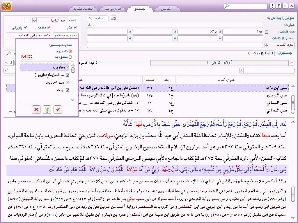 | | امکانات : | • امکان دسته بندی کتب روایی برنامه در دو محور اصلی: مصادر شیعه و مصادر اهل سنّت • قابلیت دسترسی به روایات مشابه و مقایسه بین آنها |