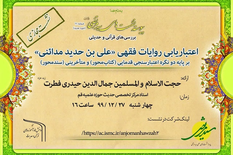این نشست با حضورحجتالاسلام والمسلمین جمالالدین حیدری فطرت، استاد مرکز تخصصی حدیث حوزه علمیه قم در روز چهارشنبه ۲۷ اسفندماه ۹۹ برگزار میشود.