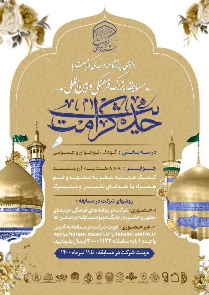 به مناسبت ایام دهه کرامت؛ به همت آستان مقدس حضرت فاطمه معصومه(س) مسابقه بزرگ فرهنگی و بینالمللی «حدیث کرامت» برگزار میشود.