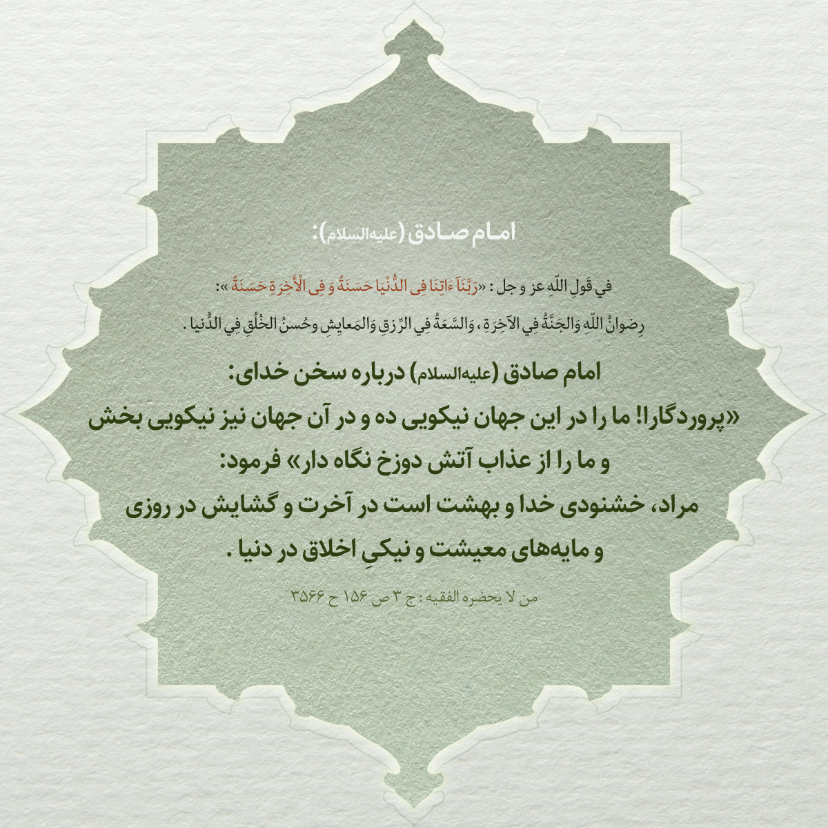 ـ في قَولِ اللّهِ عز و جل : «رَبَّنَآ ءَاتِنَا فِى الدُّنْيَا حَسَنَةً وَ فِى الْأَخِرَةِ حَسَنَةً » ـ: رِضوانُ اللّهِ وَالجَنَّةُ فِي الآخِرَةِ ، وَالسَّعَةُ فِي الرِّزقِ وَالمَعايِشِ وحُسنُ الخُلُقِ فِي الدُّنيا؛
