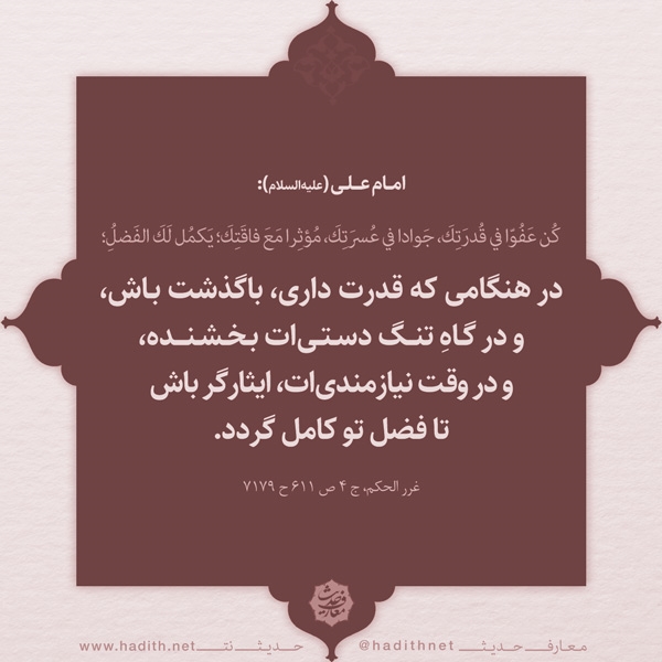 كُن عَفُوّا في قُدرَتِكَ، جَوادا في عُسرَتِكَ، مُؤثِرا مَعَ فاقَتِكَ؛ يَكمُل لَكَ الفَضلُ؛