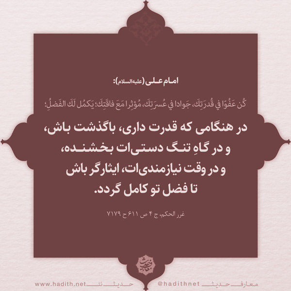 در هنگامى كه قدرت دارى، باگذشت باش، و در گاهِ تنگ دستى ات بخشنده، و در وقت نيازمندىات، ايثارگر باش تا فضل تو كامل گردد.