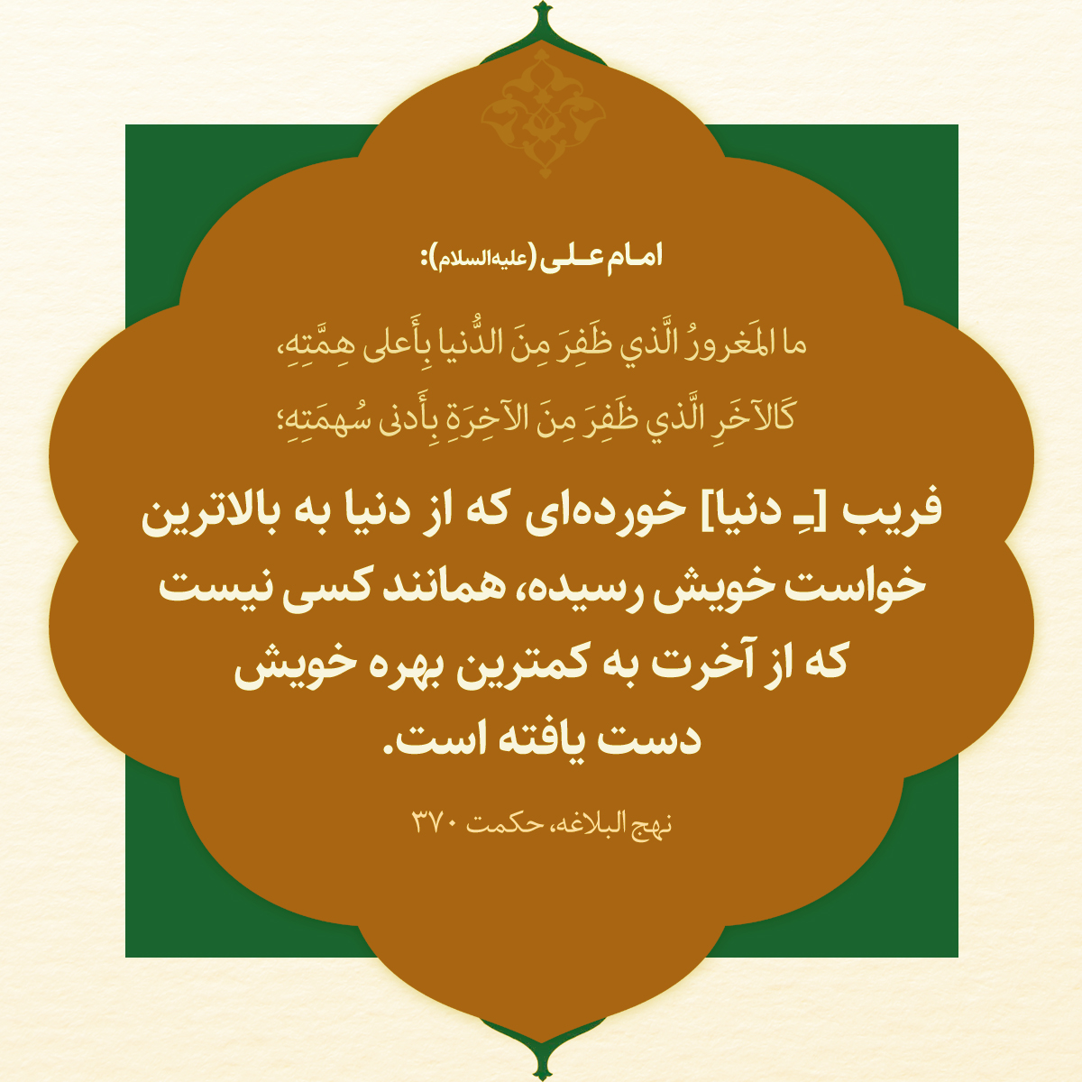 فريب [ـِ دنيا] خورده اى كه از دنيا به بالاترين خواست خويش رسيده، همانند كسى نيست كه از آخرت به كمترين بهره خويش دست يافته است.