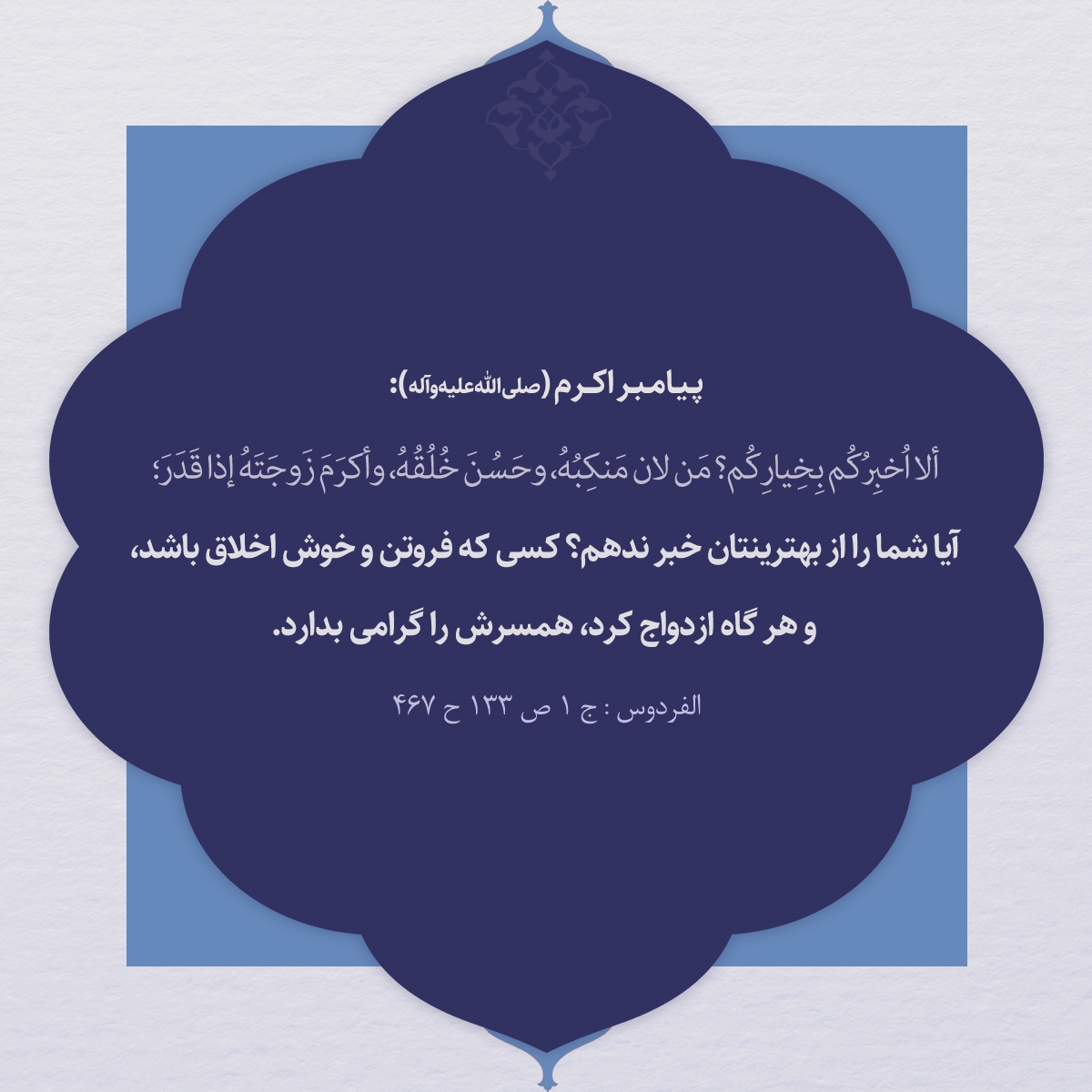 آيا شما را از بهترينتان خبر ندهم؟ كسى كه فروتن و خوش اخلاق باشد و هر گاه ازدواج كرد، همسرش را گرامى بدارد.