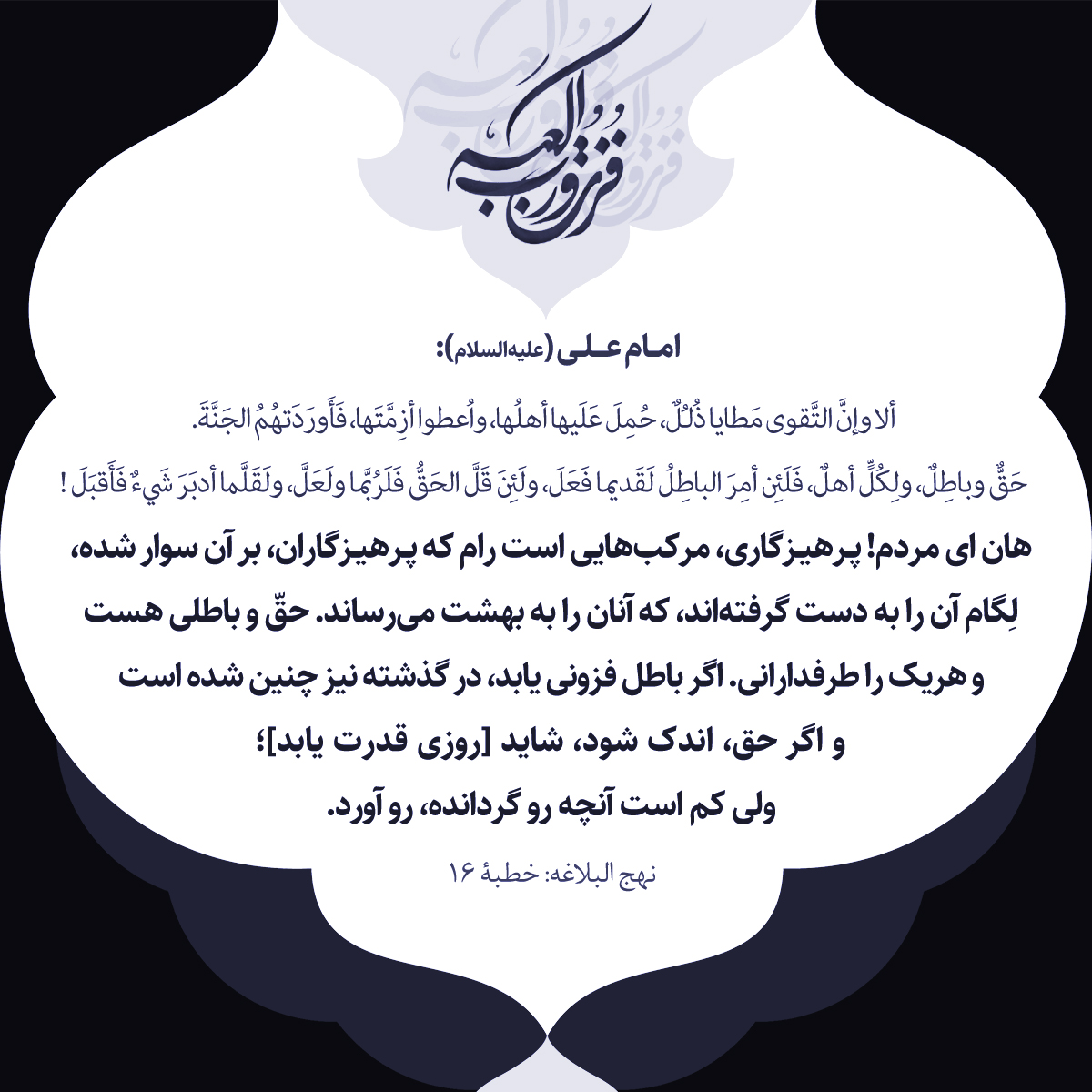 ألا وإنَّ التَّقوى مَطايا ذُلُلٌ، حُمِلَ عَلَيها أهلُها، واُعطوا أزِمَّتَها، فَأَورَدَتهُمُ الجَنَّةَ. حَقٌّ وباطِلٌ، ولِكُلٍّ أهلٌ، فَلَئِن أمِرَ الباطِلُ لَقَديما فَعَلَ، ولَئِنَ قَلَّ الحَقُّ فَلَرُبَّما ولَعَلَّ، ولَقَلَّما أدبَرَ شَيءٌ فَأَقبَلَ !