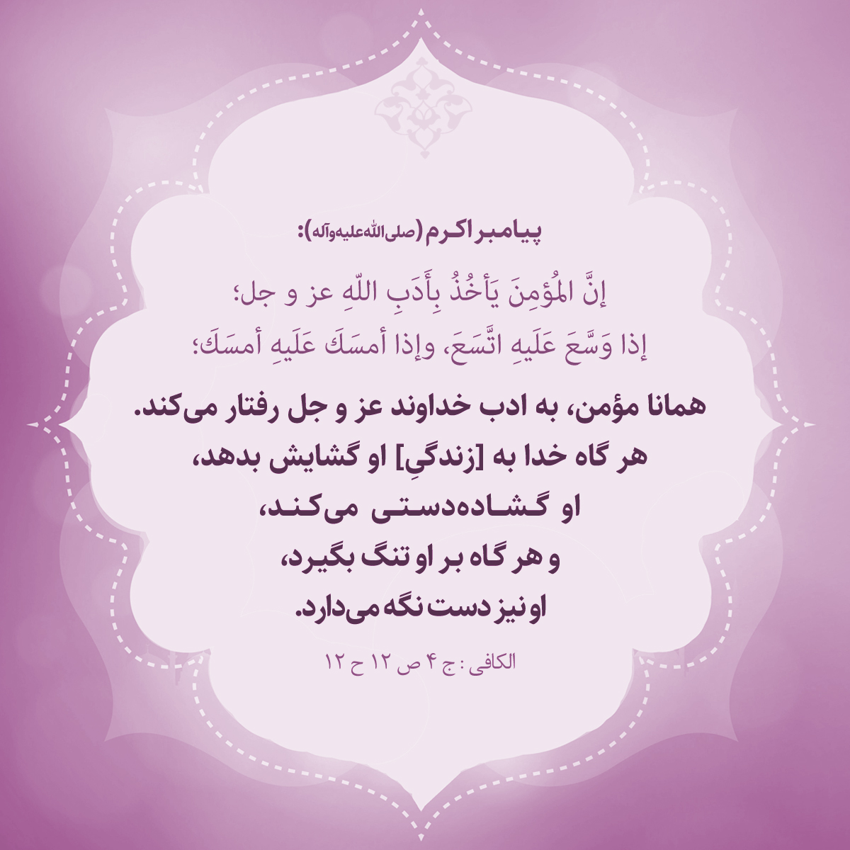 إنَّ المُؤمِنَ يَأخُذُ بِأَدَبِ اللّهِ عز و جل ؛ إذا وَسَّعَ عَلَيهِ اتَّسَعَ ، وإذا أمسَكَ عَلَيهِ أمسَكَ؛