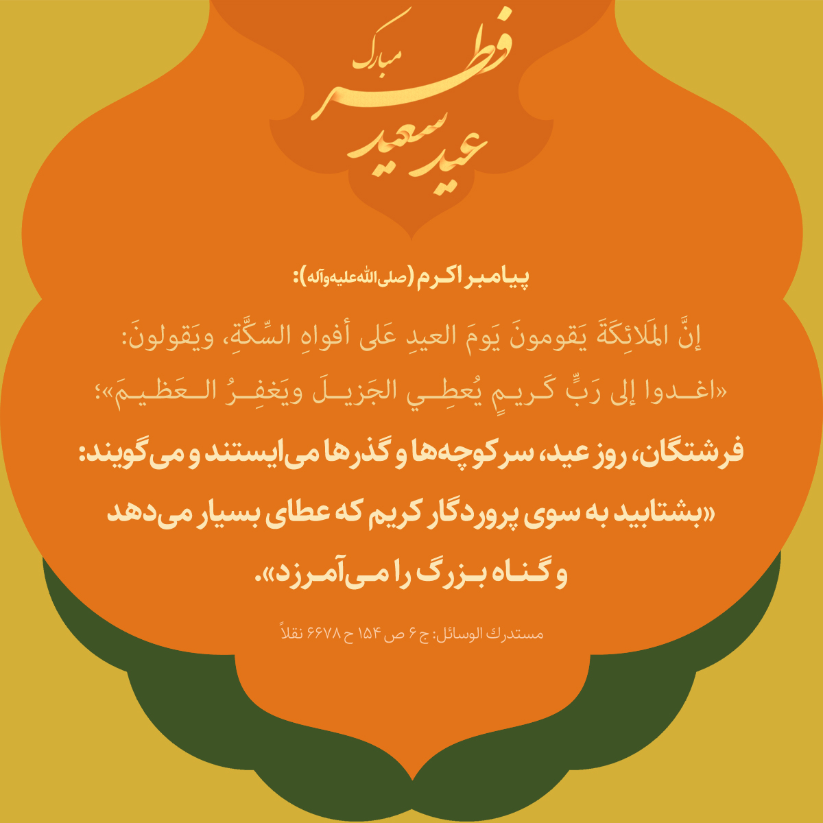 فرشتگان، روز عيد، سركوچهها و گذرها مىايستند و مىگويند: «بشتابيد به سوى پروردگار كريم كه عطاى بسيار مىدهد و گناه بزرگ را مىآمرزد.