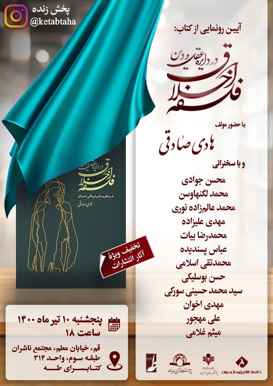 به گزارش روابط عمومی پژوهشگاه قرآن و حدیث، آیین رونمایی از کتاب «فلسفه اخلاق در دایره عقل و دین» از آثار پژوهشگاه قرآن و حدیث، با همکاری پژوهشگاه قرآن و حدیث و انتشارات طه، با حضورحجت الاسلام و المسلمین دکتر هادی صادقی، مولف کتاب و با سخنرانی آقایان محسن جوادی، محمد لگنهاوسن، محمد عالم زاده نوری، مهدی علیزاده، محمدرضا بیات،عباس پسندیده، محمدتقی اسلامی، حسن بوسلیکی، سیدمحمد حسینی سورکی، مهدی اخوان، علی مهجور و میثم غلامی در روز پنجشنبه ۱۰ تیر ماه از ساعت ۱۸در مجتمع ناشران برگزار می گردد.