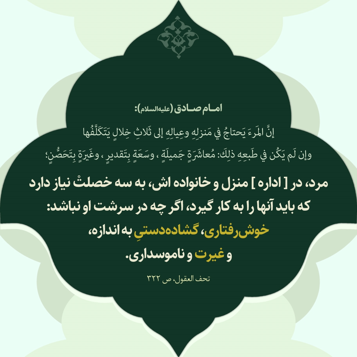 مرد، در [ اداره ] منزل و خانواده اش، به سه خصلتْ نياز دارد كه بايد آنها را به كار گيرد، اگر چه در سرشت او نباشد: خوش رفتارى، گشاده دستىِ به اندازه، و غيرت و ناموسدارى.
