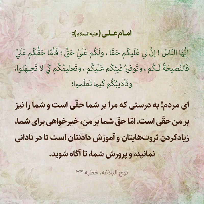 اى مردم! به درستى كه مرا بر شما حقّى است و شما را نيز بر من حقّى است. امّا حقّ شما بر من، خيرخواهى براى شما، زيادكردن ثروتهايتان و آموزش دادنتان است تا در نادانى نمانيد، و پرورش شما، تا آگاه شويد.