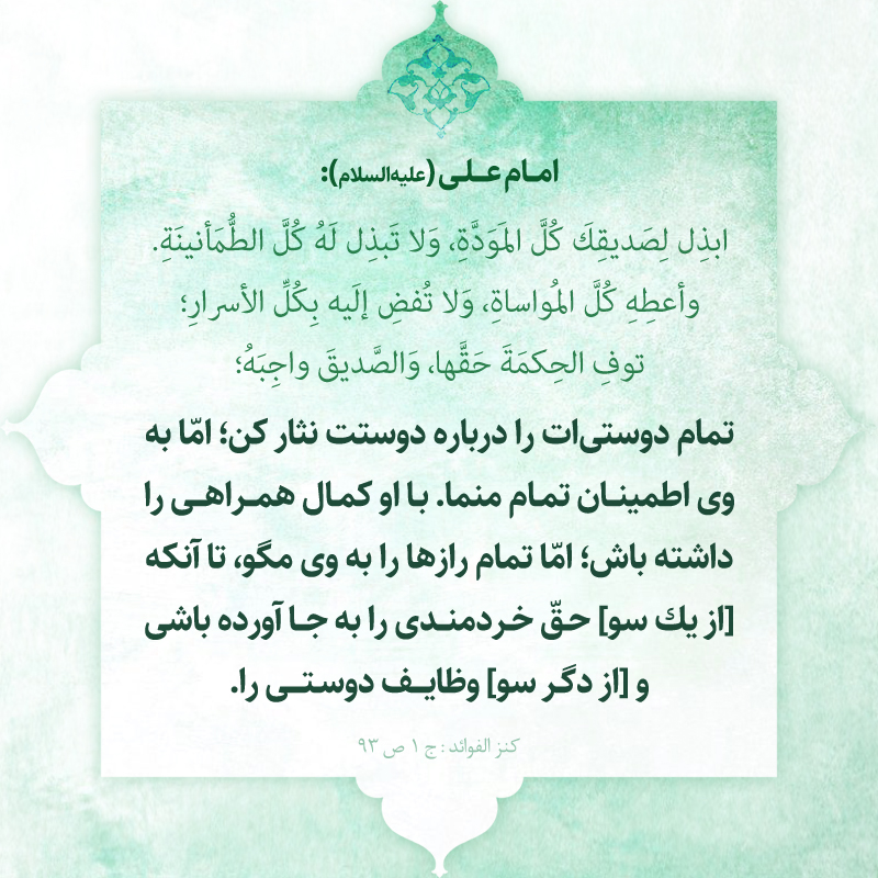 تمام دوستى ات را درباره دوستت نثار كن؛ امّا به وى اطمينان تمام منما . با او كمال همراهى را داشته باش ؛ امّا تمام رازها را به وى مگو ، تا آنكه [از يك سو ]حقّ خردمندى را به جا آورده باشى و [از دگر سو ]وظايف دوستى را.