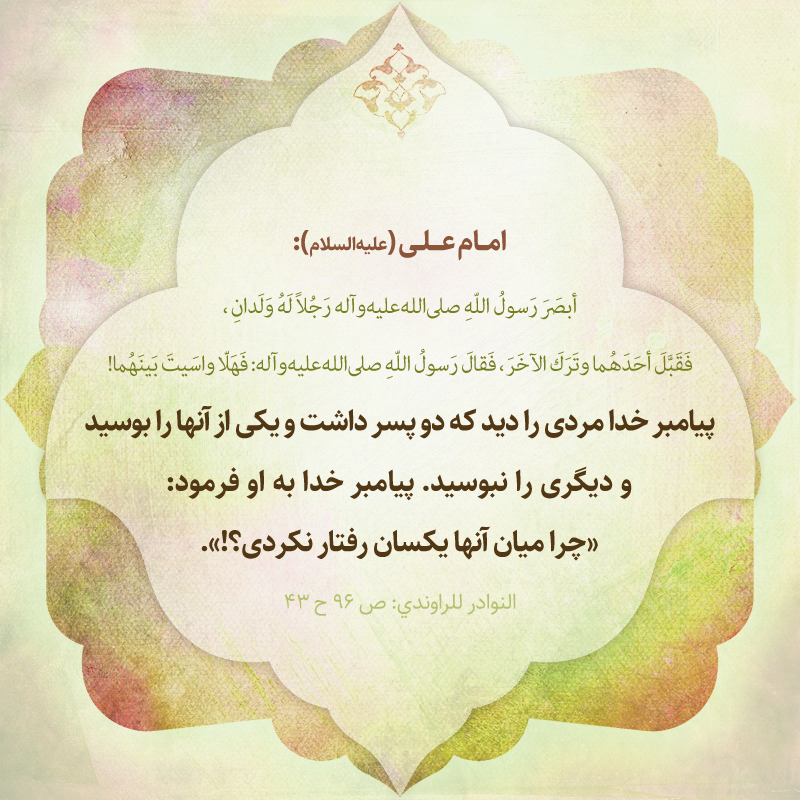 پيامبر خدا مردى را ديد كه دو پسر داشت و يكى از آنها را بوسيد و ديگرى را نبوسيد . پيامبر خدا به او فرمود : «چرا ميان آنها يكسان رفتار نكردى؟!