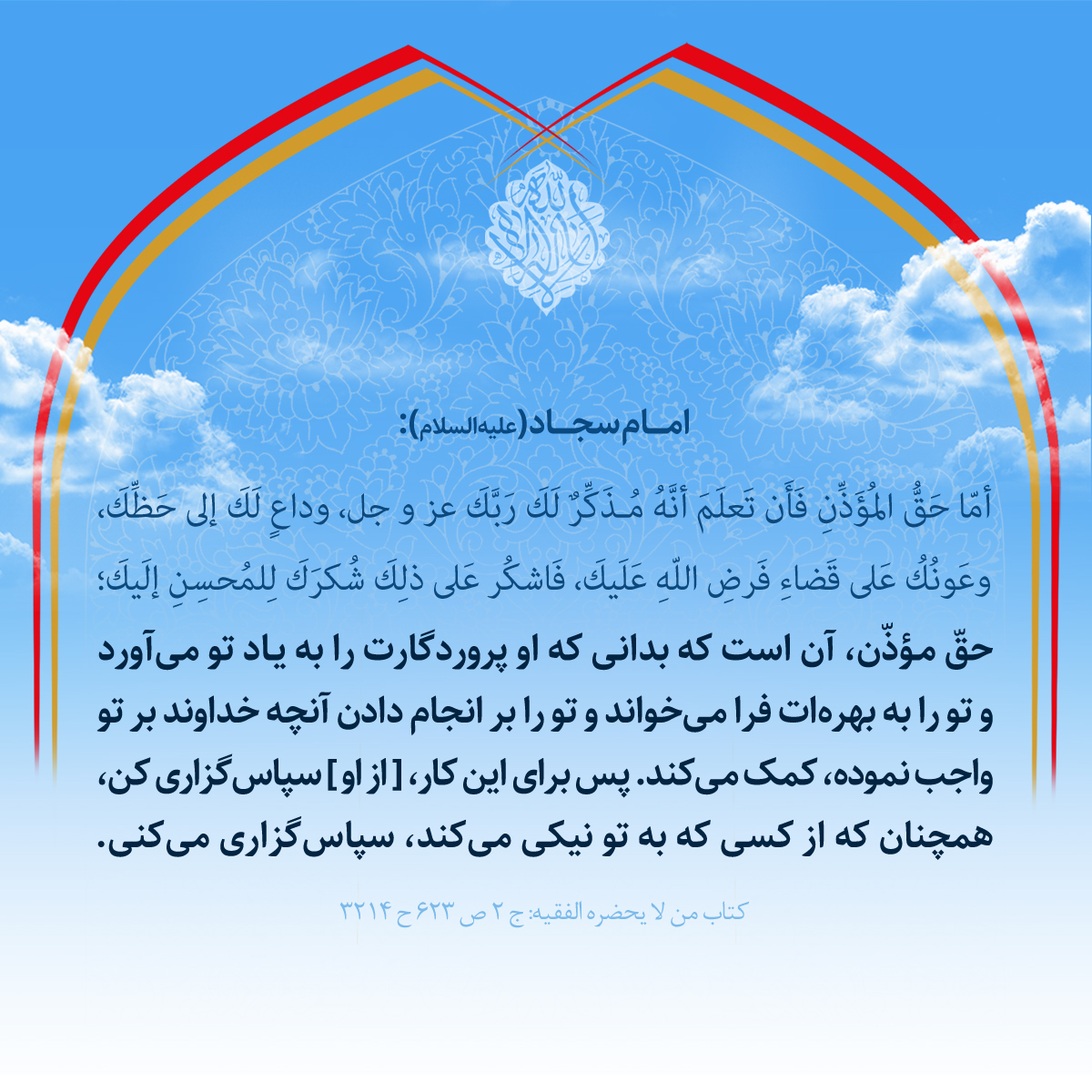 أمّا حَقُّ المُؤَذِّنِ فَأَن تَعلَمَ أنَّهُ مُذَكِّرٌ لَكَ رَبَّكَ عز و جل ، وداعٍ لَكَ إلى حَظِّكَ ، وعَونُكُ عَلى قَضاءِ فَرضِ اللّهِ عَلَيكَ ، فَاشكُر عَلى ذلِكَ شُكرَكَ لِلمُحسِنِ إلَيكَ؛