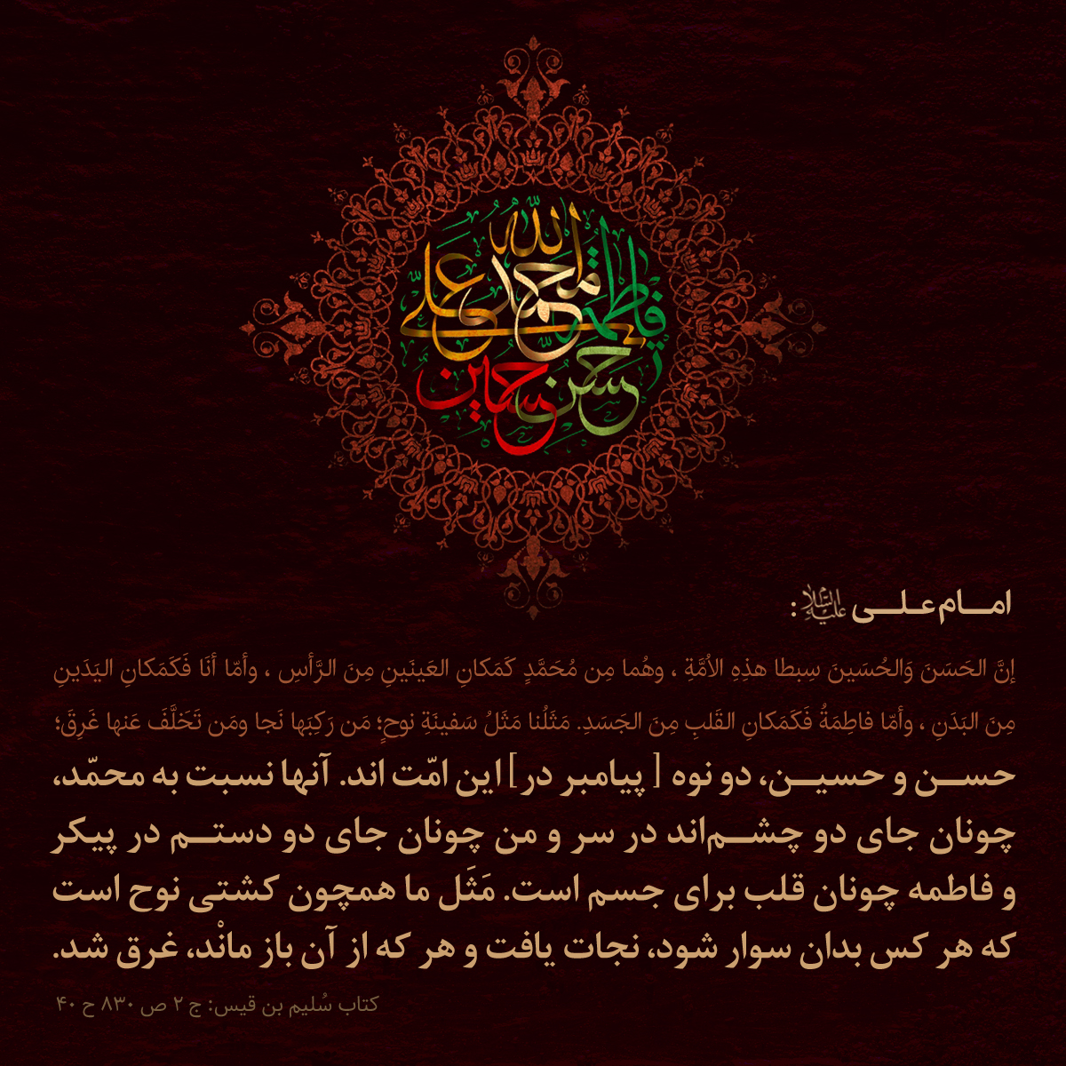 حسن و حسين، دو نوه [پيامبر در] اين امّت اند. آنها نسبت به محمّد، چونان جاى دو چشماند در سر و من چونان جاى دو دستم در پيكر و فاطمه چونان قلب براى جسم است. مَثَل ما همچون كشتى نوح است كه هر كس بدان سوار شود، نجات يافت و هر كه از آن باز مانْد، غرق شد.