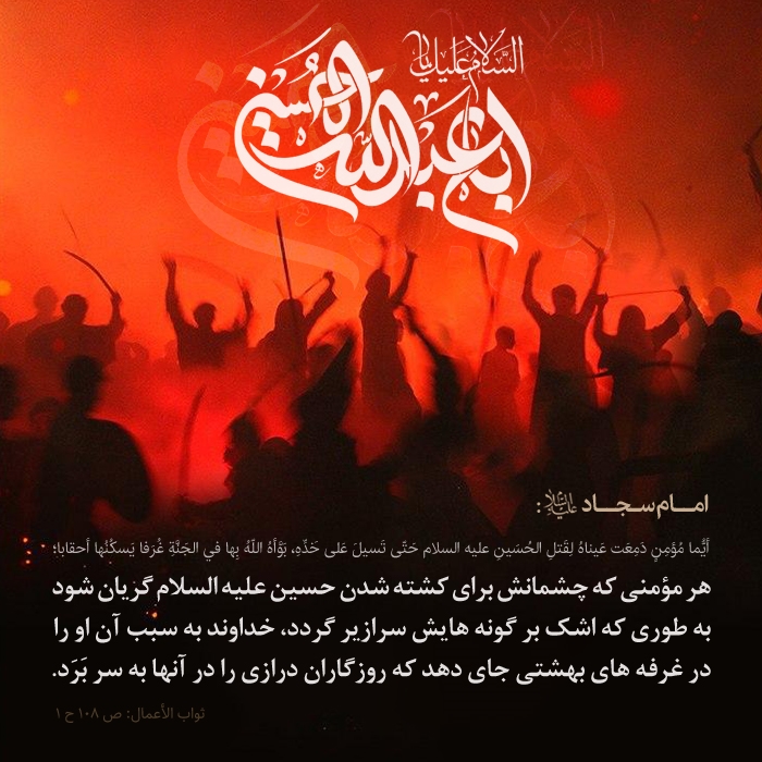 هر مؤمنى كه چشمانش براى كشته شدن حسين عليه السلام گريان شود به طورى كه اشك بر گونه هايش سرازير گردد، خداوند به سبب آن او را در غرفه هاى بهشتى جاى دهد كه روزگاران درازى را در آنها به سر بَرَد