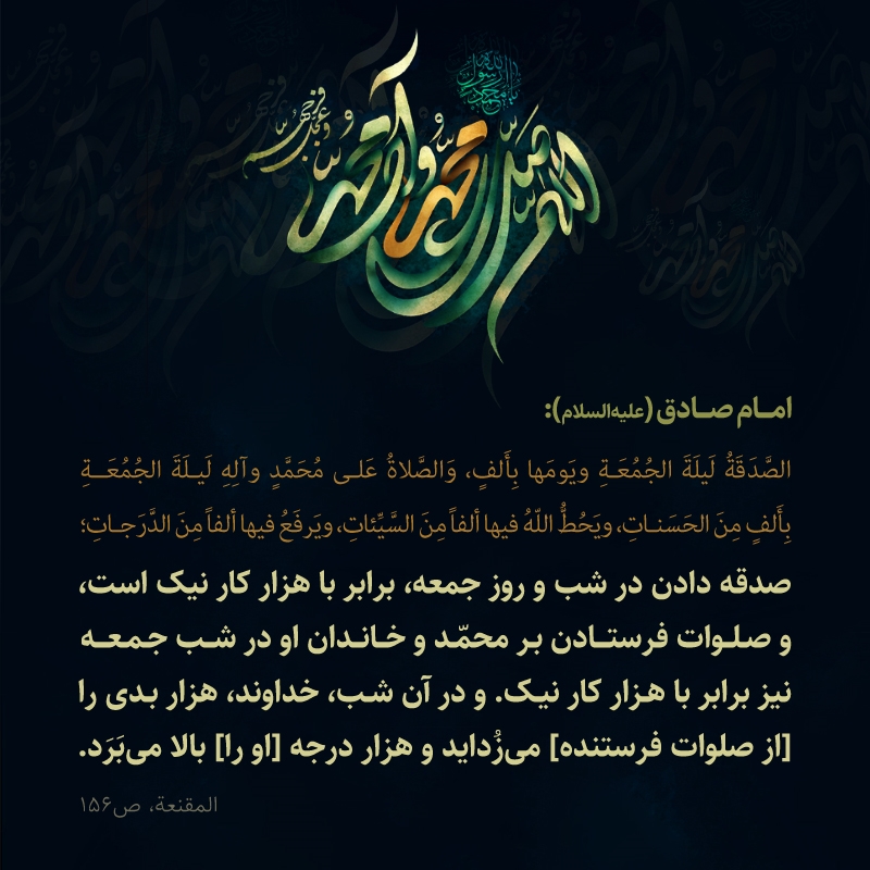 صدقه دادن در شب و روز جمعه، برابر با هزار کار نيک است، و صلوات فرستادن بر محمّد و خاندان او در شب جمعه نیز برابر با هزار کار نيک. و در آن شب، خداوند، هزار بدی را [از صلوات فرستنده] مىزُدايد و هزار درجه [او را] بالا مىبَرَد.