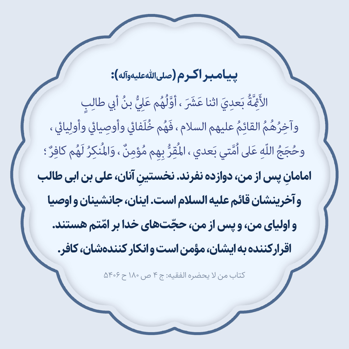 امامانِ پس از من، دوازده نفرند. نخستينِ آنان، على بن ابى طالب و آخرينشان قائم عليه السلام است. اينان، جانشينان و اوصيا و اولياى من و پس از من، حجّت هاى خدا بر امّتم هستند. اقرار كننده به ايشان، مؤمن است و انكار كننده شان، كافر
