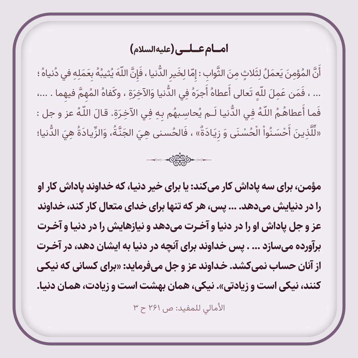 أَنَّ المُؤمِنَ يَعمَلُ لِثَلاثٍ مِنَ الثَّوابِ: إِمّا لِخَيرِ الدُّنيا، فَإِنَّ اللّهَ يُثيبُهُ بِعَمَلِهِ في دُنياهُ؛ ....، فَمَن عَمِلَ للّهِِ تَعالى أَعطاهُ أَجرَهُ فِي الدُّنيا وَالآخِرَةِ وكَفاهُ المُهِمَّ فيهِما. ...، فَما أَعطاهُمُ اللّهُ فِي الدُّنيا لَم يُحاسِبهُم بِهِ فِي الآخِرَةِ. قالَ اللّهُ عز و جل: «لِّلَّذِينَ أَحْسَنُواْ الْحُسْنَى وَ زِيَادَةٌ»، فَالحُسنى هِيَ الجَنَّةُ وَالزِّيادَةُ هِيَ الدُّنيا؛