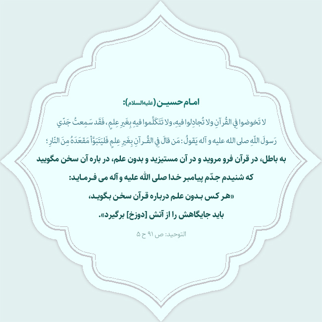 لا تَخوضوا فِي القُرآنِ ولا تُجادِلوا فيهِ، ولا تَتَكَلَّموا فيهِ بِغَيرِ عِلمٍ ، فَقَد سَمِعتُ جَدّي رَسولَ اللّهِ صلى الله عليه و آله يَقولُ : مَن قالَ فِي القُرآنِ بِغَيرِ عِلمٍ فَليَتَبَوَّأ مَقعَدَهُ مِنَ النّارِ؛