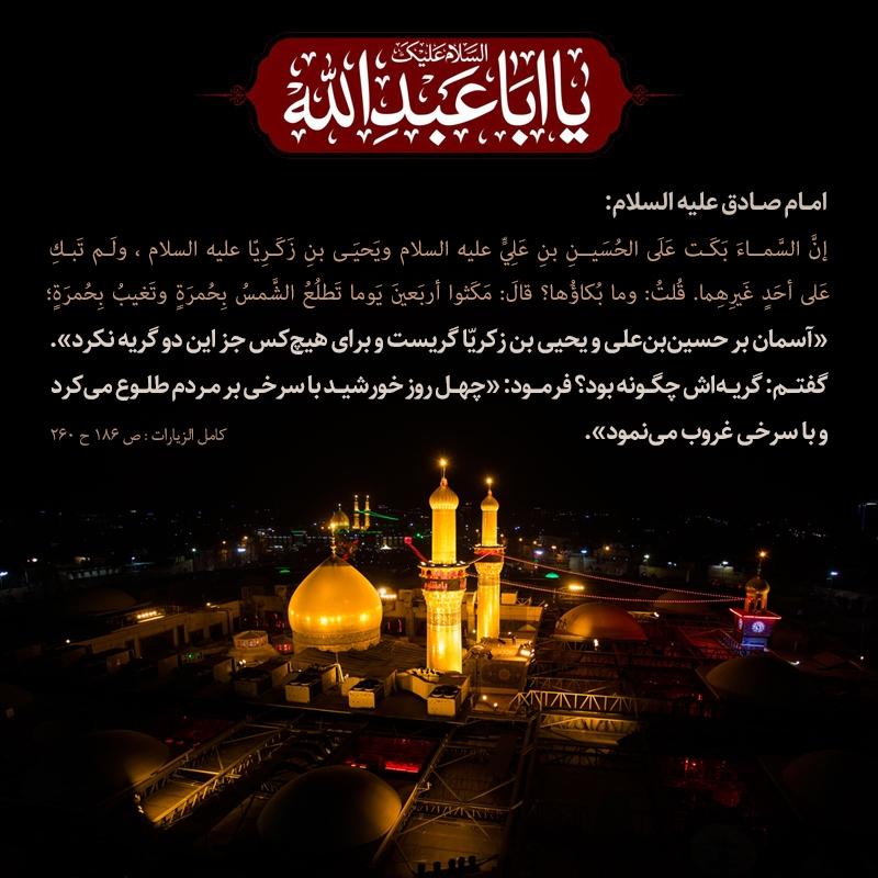 «آسمان بر حسينبنعلى و يحيى بن زكريّا گريست و براى هيچكس جز اين دو گريه نكرد». گفتم: گريهاش چگونه بود؟ فرمود: «چهل روز خورشيد با سرخى بر مردم طلوع مىكرد و با سرخى غروب مىنمود».