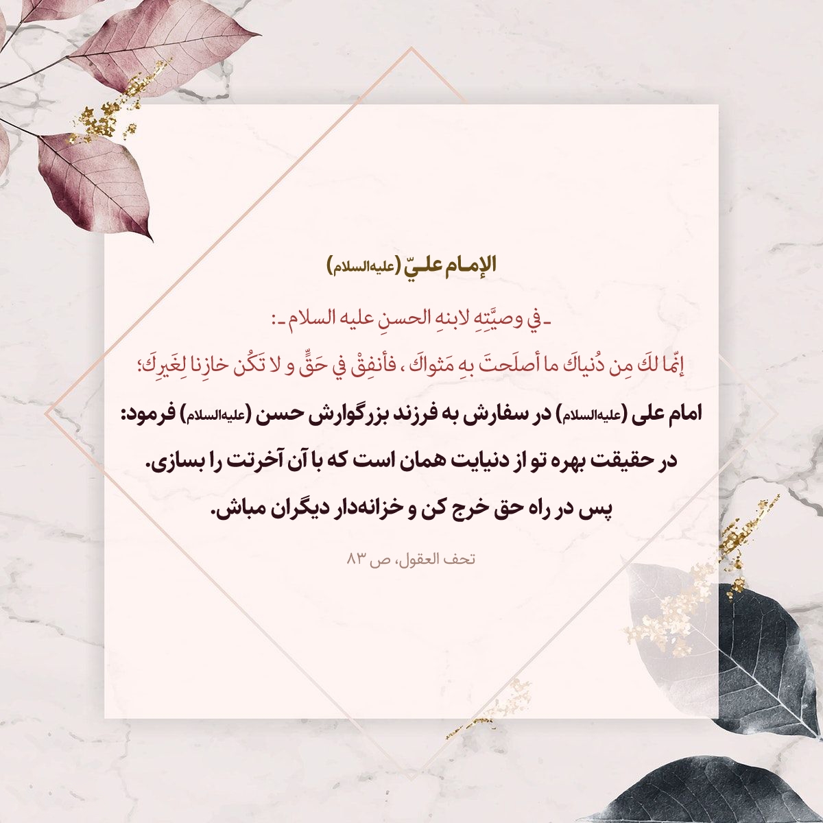 ـ في وصيَّتِهِ لابنهِ الحسنِ عليه السلام ـ: إنّما لكَ مِن دُنياكَ ما أصلَحتَ بهِ مَثواكَ، فأنفِقْ في حَقٍّ و لا تَكُن خازِنا لِغَيرِكَ؛