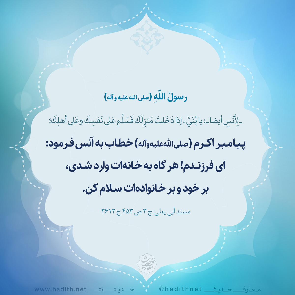 ـ خطاب به اَنَس ـ :اى فرزندم ! هر گاه به خانه ات وارد شدى، بر خود و بر خانواده ات سلام كن.