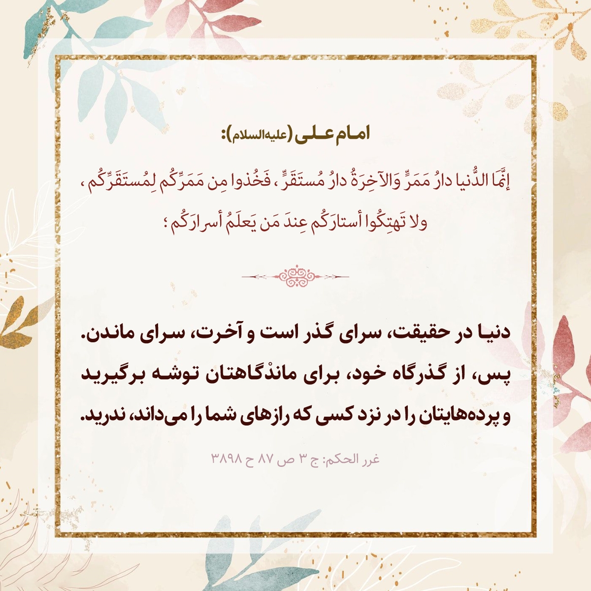 دنيا در حقيقت، سراى گذر است و آخرت، سراى ماندن. پس، از گذرگاه خود، براى ماندْگاهتان توشه برگيريد و پرده هايتان را در نزد كسى كه رازهاى شما را مى داند، ندريد.