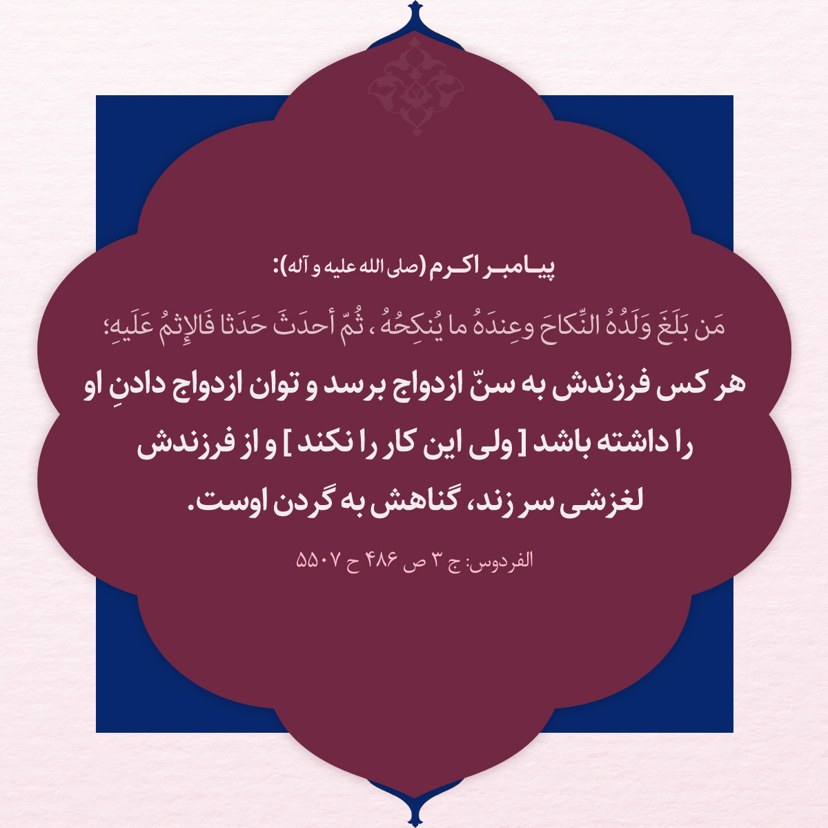 هر كس فرزندش به سنّ ازدواج برسد و توان ازدواج دادنِ او را داشته باشد [ ولى اين كار را نكند ] و از فرزندش لغزشى سر زند، گناهش به گردن اوست.