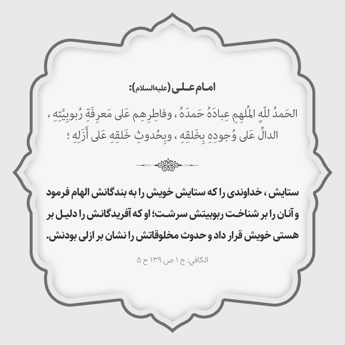 ستايش، خداوندى را كه ستايش خويش را به بندگانش الهام فرمود و آنان را بر شناخت ربوبيتش سرشت؛ او كه آفريدگانش را دليل بر هستى خويش قرار داد و حدوث مخلوقاتش را نشان بر ازلى بودنش.