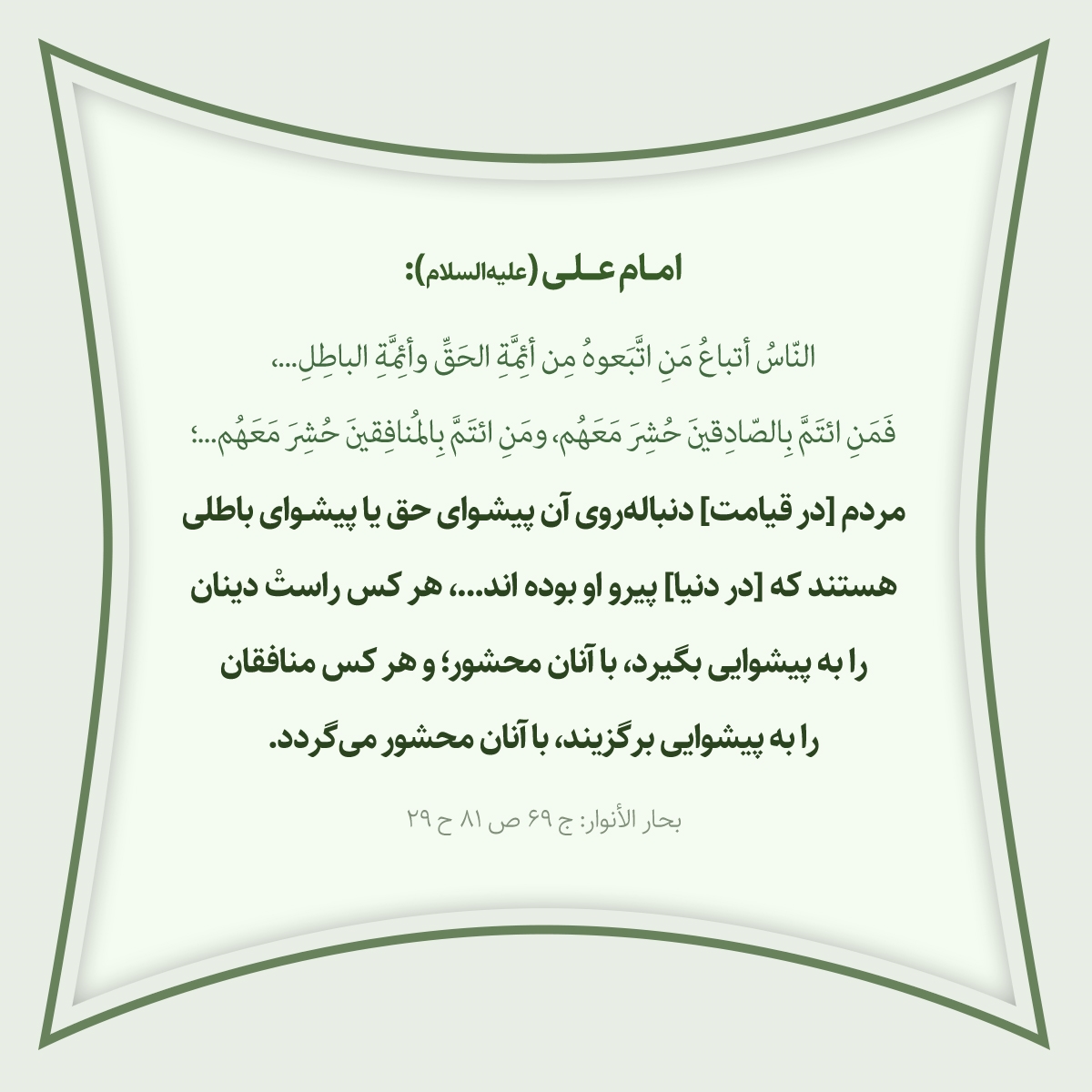 النّاسُ أتباعُ مَنِ اتَّبَعوهُ مِن أئِمَّةِ الحَقِّ وأئِمَّةِ الباطِلِ...، فَمَنِ ائتَمَّ بِالصّادِقينَ حُشِرَ مَعَهُم، ومَنِ ائتَمَّ بِالمُنافِقينَ حُشِرَ مَعَهُم؛