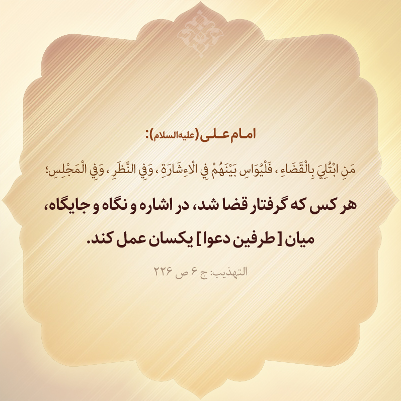 هر كس كه گرفتار قضا شد، در اشاره و نگاه و جايگاه، ميان [طرفين دعوا] يكسان عمل كند.