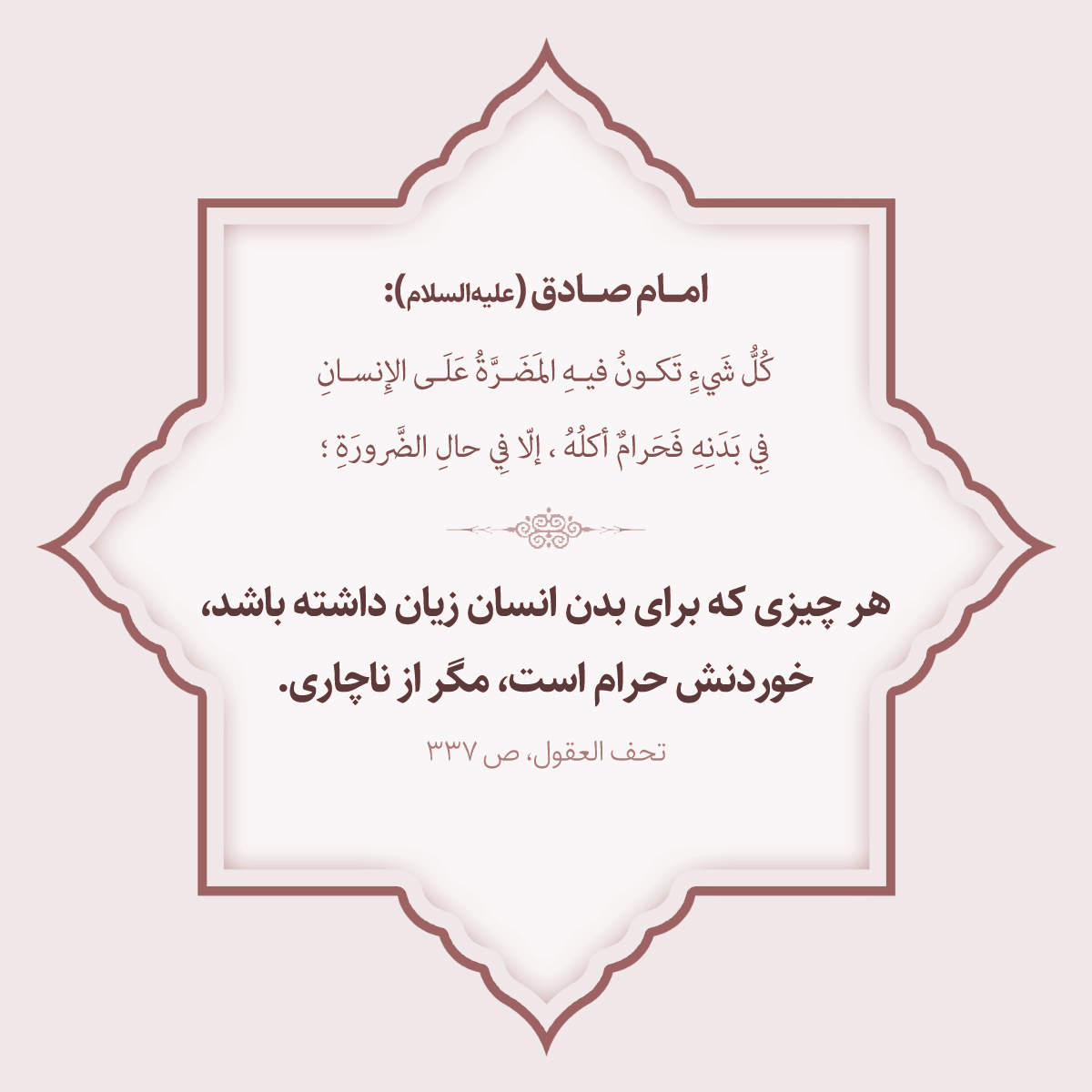 كُلُّ شَيءٍ تَكونُ فيهِ المَضَرَّةُ عَلَى الإِنسانِ فِي بَدَنِهِ فَحَرامٌ أكلُهُ، إلّا فِي حالِ الضَّرورَةِ؛