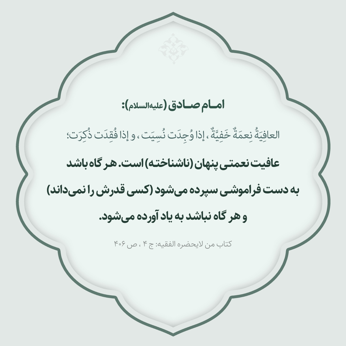 عافيت نعمتى پنهان (ناشناخته) است. هر گاه باشد به دست فراموشى سپرده مىشود ( كسى قدرش را نمىداند) و هر گاه نباشد به ياد آورده مىشود.