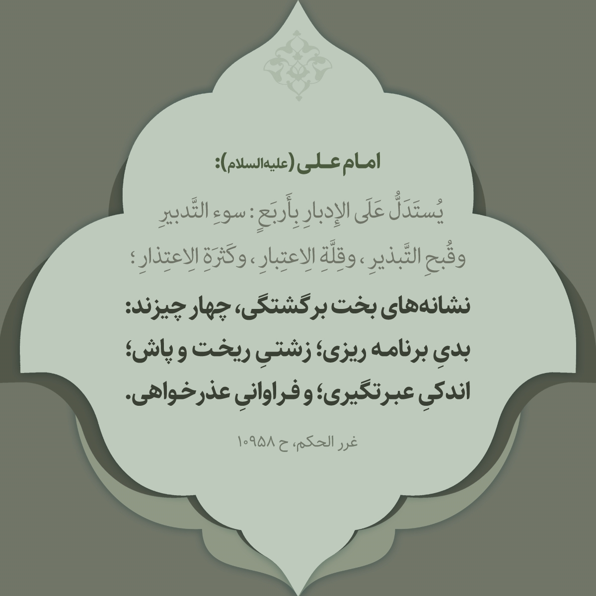 يُستَدَلُّ عَلَى الإِدبارِ بِأَربَعٍ : سوءِ التَّدبيرِ وقُبحِ التَّبذيرِ و قِلَّةِ الِاعتِبارِ و كَثرَةِ الِاعتِذارِ؛