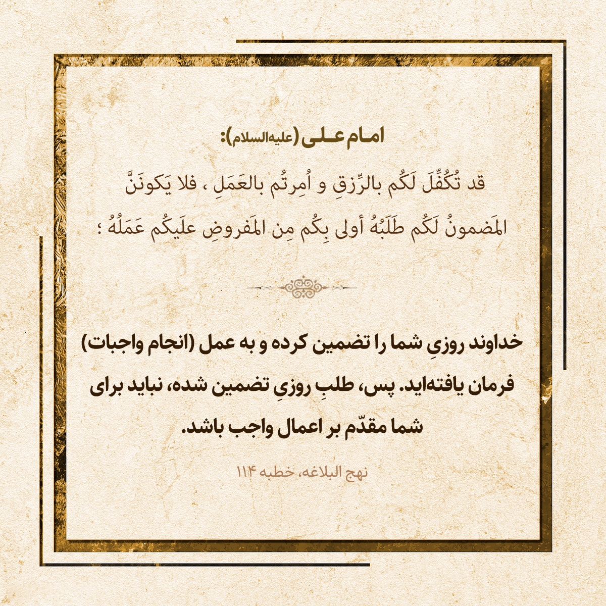 قد تُكُفِّلَ لَكُم بالرِّزقِ و اُمِرتُم بالعَمَلِ، فلا يَكونَنَّ المَضمونُ لَكُم طَلَبُهُ أولى بِكُم مِن المَفروضِ علَيكُم عَمَلُهُ؛