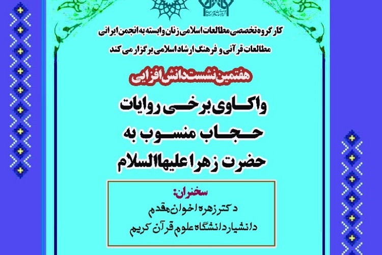 هفتمین نشست دانشافزایی از سوی کارگروه مطالعات اسلامی زنان وابسته به انجمن ایرانی مطالعات قرآنی و فرهنگ ارشاد اسلامی با موضوع واکاوی برخی روایات حجاب منسوب به حضرت زهرا(س) برگزار میشود.