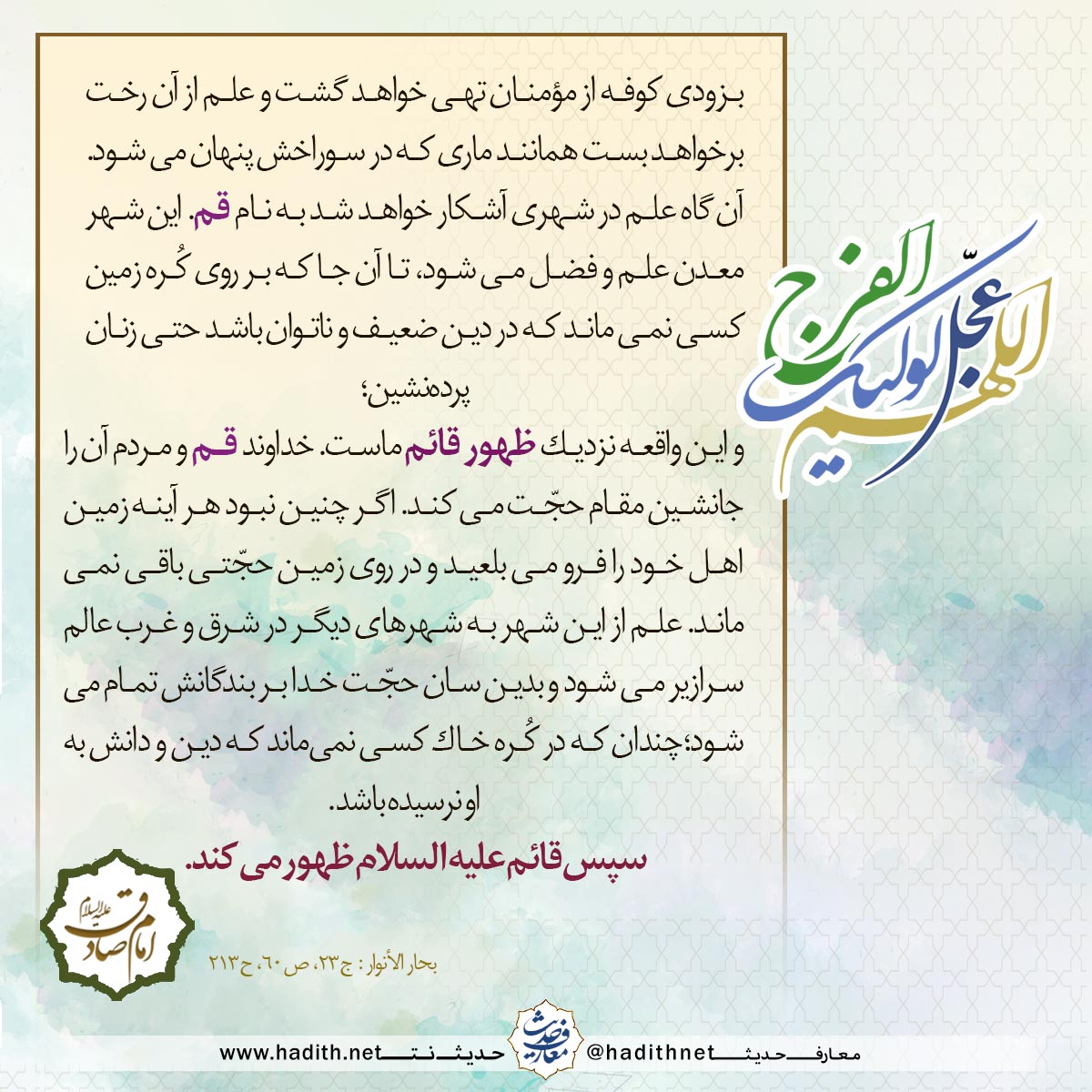 ثُمّ يَظهَرُ العلمُ ببلدةٍ يُقالُ لها قُمّ ، و تَصيرُ مَعْدِنا للعِلمِ و الفَضلِ، حتّى لا يَبقى في الأرضِ مُسْتَضعَفٌ في الدِّينِ حتّى المُخَدَّراتُ في الحِجالِ ، و ذلكَ عند قُرْبِ ظُهورِ قائمِنا ، فيَجْعَلُ اللّهُ قُمّ و أهلَهُ قائمِينَ مَقامَ الحُجّةِ، و لو لا ذلكَ لَساخَتِ الأرضُ بأهْلِها، و لَم يَبْقَ في الأرضِ حُجّةٌ ، فَيَفيضُ العِلمُ مِنهُ إلى سائرِ البلادِ في المَشرِقِ و المَغرِبِ ، فَيتِمُّ حُجّةُ اللّهِ على الخلقِ ، حتّى لا يَبْقى أحدٌ على الأرضِ لم يَبْلُغْ إليهِ الدِّينُ و العِلمُ ، ثُمّ يَظْهرُ القائمُ عليه السلام .