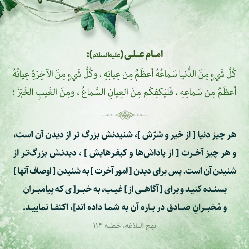 هر چيز دنيا [از خير و شرّش]، شنيدنش بزرگ تر از ديدن آن است و هر چيز آخرت [از پاداش ها و كيفرهايش]، ديدنش بزرگ تر از شنيدن آن است. پس براى ديدن [امور آخرت] به شنيدن [اوصاف آنها] بسنده كنيد و براى [آگاهى از] غيب، به خبر[ى كه پيامبران و مُخبرانِ صادق در باره آن به شما داده اند]، اكتفا نماييد.