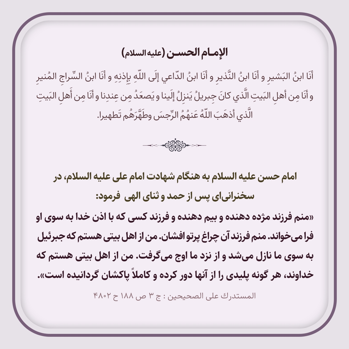 امام حسن عليه السلام ـ به هنگام شهادت امام على عليه السلام، در سخنرانىاى پس از حمد و ثناى الهى ـ: منم فرزند مژده دهنده و بيم دهنده و فرزند كسى كه با اذن خدا به سوى او فرا مىخواند. منم فرزند آن چراغ پرتو افشان. من از اهل بيتى هستم كه جبرئيل به سوى ما نازل مىشد و از نزد ما اوج مىگرفت. من از اهل بيتى هستم كه خداوند، هر گونه پليدى را از آنها دور كرده و كاملاً پاكشان گردانيده است.