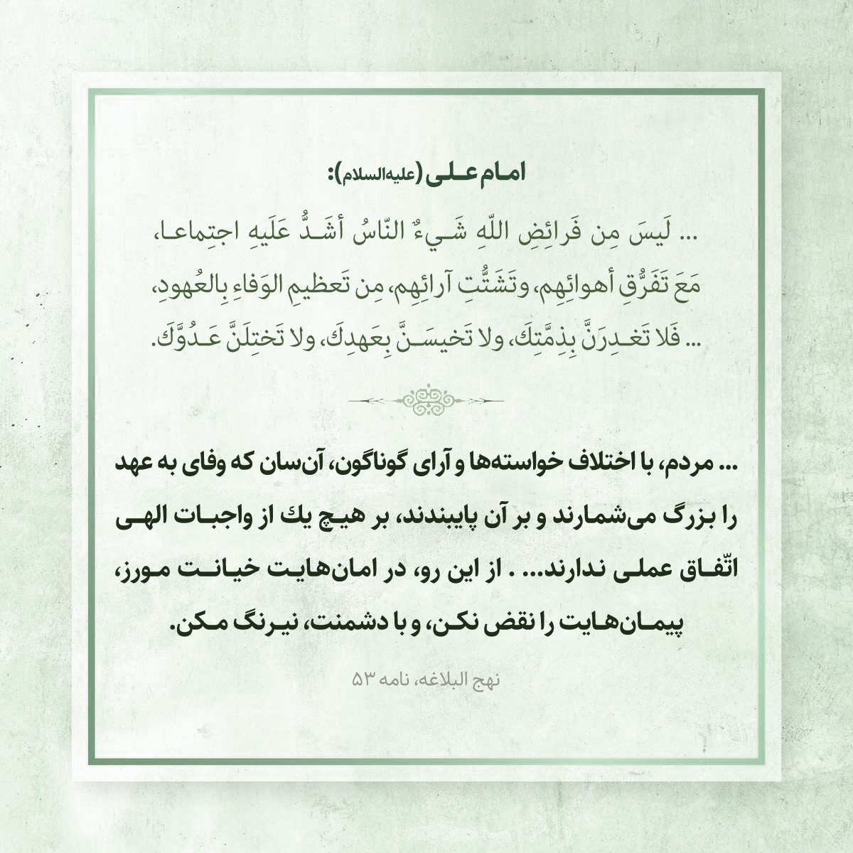 مردم، با اختلاف خواستهها و آراى گوناگون، آنسان كه وفاى به عهد را بزرگ مىشمارند و بر آن پايبندند، بر هيچ يك از واجبات الهى اتّفاق عملى ندارند... . از اين رو، در امانهايت خيانت مورز، پيمان هايت را نقض نكن و با دشمنت، نيرنگ مكن.