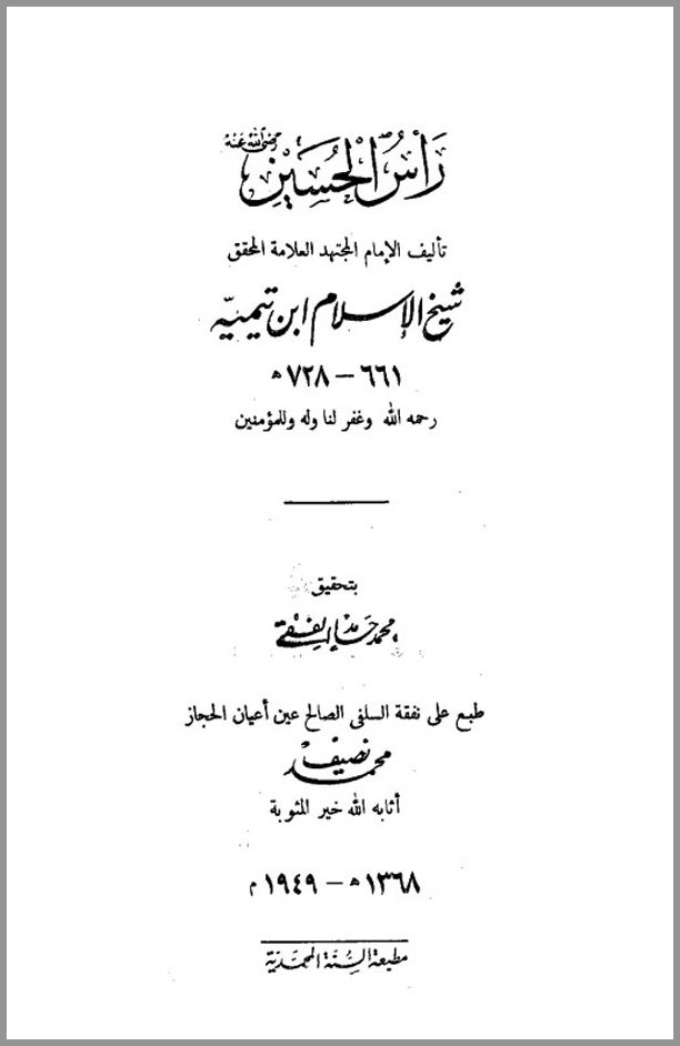 رأس الحسین در پی پرسشهایی درباره محل دفن سر امام حسین - ع - فراهم شده است. این تیمیه در این رساله عهده دار اثبات این موضوع است که محل دفن سر آن حضرت، عسقلان (در سوریه) و قاهره نیست، بلکه مدینه است. وی هشت دلیل برای این موضوع اقامه کرده که چکیده آن چنین است: