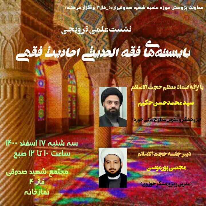 به گزارش پایگاه حدیث نت، نشست علمی ترويجی « بايسته های فقه الحديثی احاديث فقهی» با ارائه حجت الاسلامدکتر سيد محمد حسن حکيم، و به دبيریحجت الاسلام مجتبی پورموسیروز سه شنبه،هفدهم اسفندماه ۱۴۰۰، در مجتمع شهید صدوقی قم برگزار شد.
