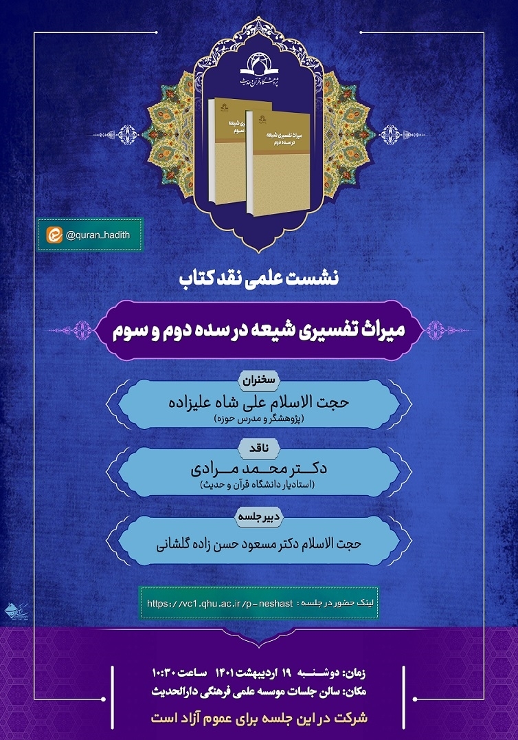 نشست علمی نقد کتاب "میراث تفسیری شیعه در سده دوم و سوم" از سوی پژوهشکده تفسیر اهل بیت علیهم السلام پژوهشگاه قرآن و حدیث برگزار می شود.
