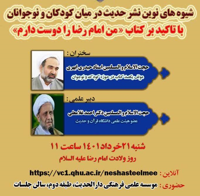 نشست «شیوههای نوین نشر حدیث در میان کودکان و نوجوانان؛ با تأکید بر کتاب من امام رضا را دوست دارم» از سلسله نشستهای حدیثپژوهی، روز گذشته، ۲۱ خردادماه به میزبانی انجمن علمی حدیث حوزه و با همکاری دانشگاه قرآن و حدیث و مرکز مدیریت حوزه علمیه خواهران در سالن جلسات موسسه علمی فرهنگی دارالحدیث برگزار شد.