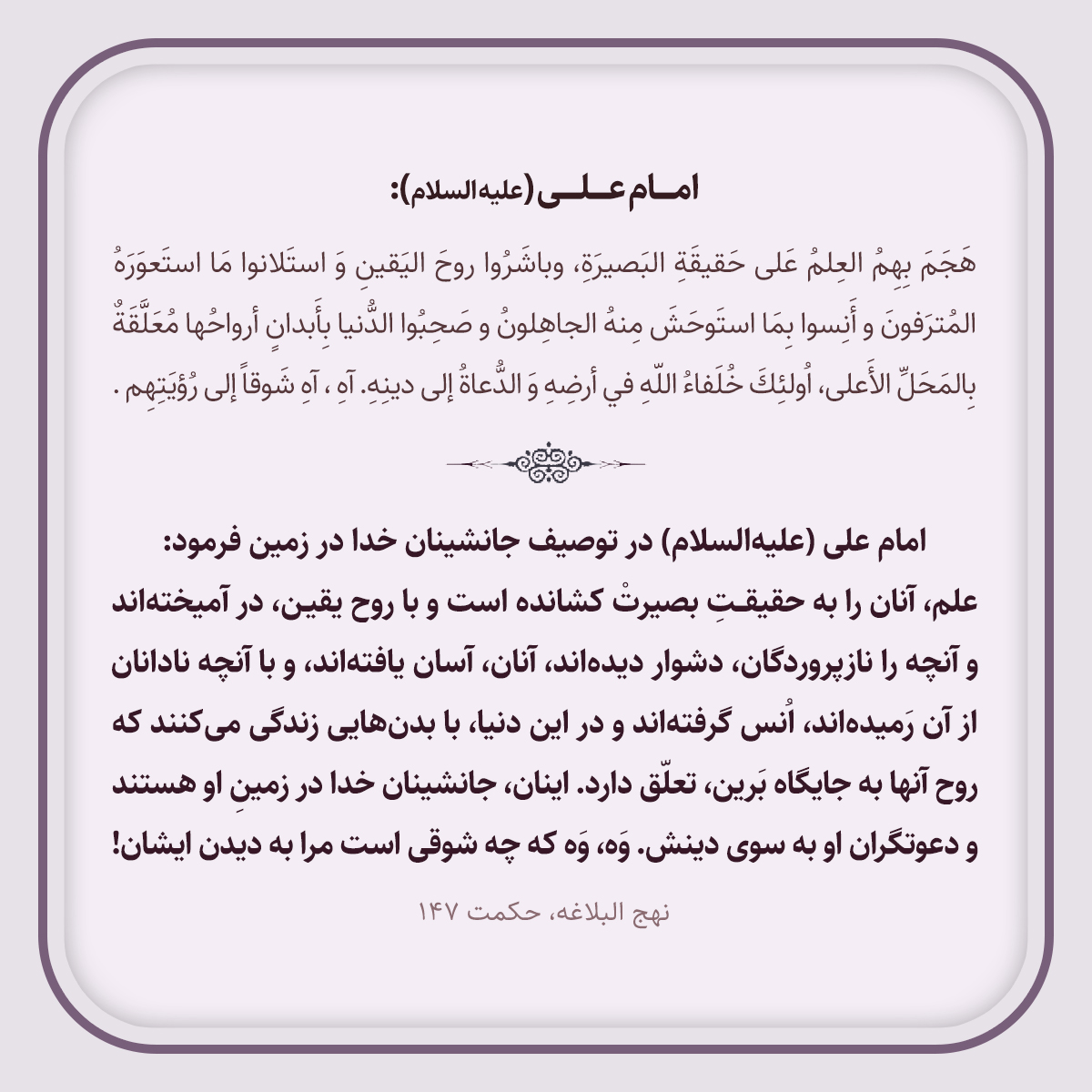 در توصيف جانشينان خدا در زمين ـ : علم ، آنان را به حقيقتِ بصيرتْ كشانده است و با روح يقين، در آميختهاند و آنچه را نازپروردگان، دشوار ديدهاند، آنان، آسان يافتهاند، و با آنچه نادانان از آن رَميدهاند، اُنس گرفتهاند و در اين دنيا، با بدنهايى زندگى مىكنند كه روح آنها به جايگاه بَرين، تعلّق دارد. اينان، جانشينان خدا در زمينِ او هستند و دعوتگران او به سوى دينش. وَه ، وَه كه چه شوقى است مرا به ديدن ايشان!