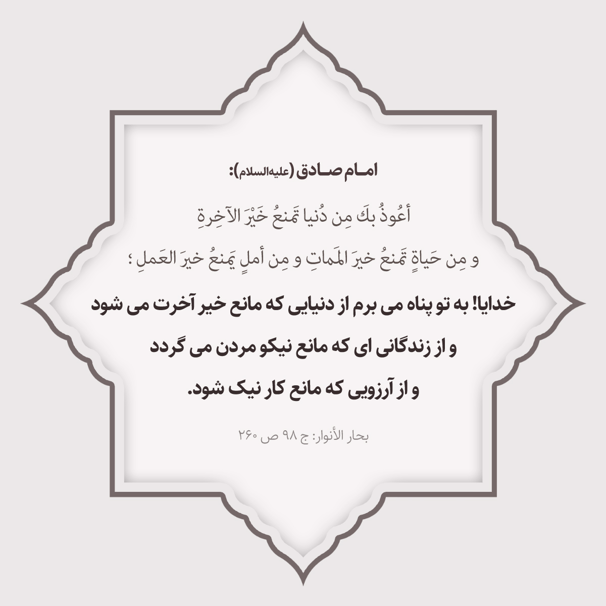 أعُوذُ بكَ مِن دُنيا تَمنعُ خَيْرَ الآخِرةِ و مِن حَياةٍ تَمنعُ خيرَ المَماتِ و مِن أملٍ يَمنعُ خيرَ العَملِ؛