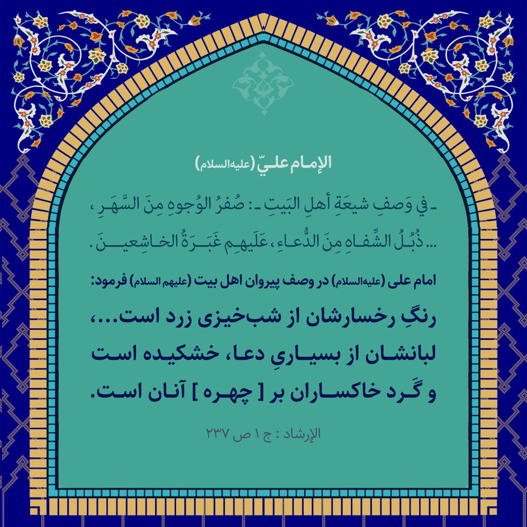 ـ في وَصفِ شيعَةِ أهلِ البَيتِ ـ: صُفرُ الوُجوهِ مِنَ السَّهَرِ ،... ذُبُلُ الشِّفاهِ مِنَ الدُّعاءِ ، عَلَيهِم غَبَرَةُ الخاشِعينَ؛